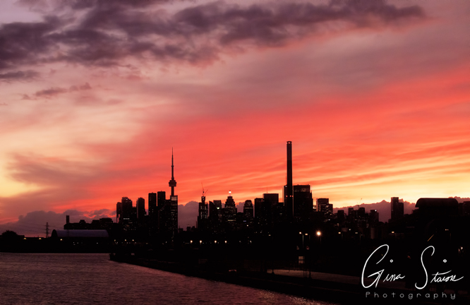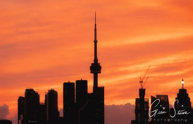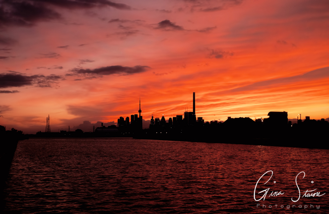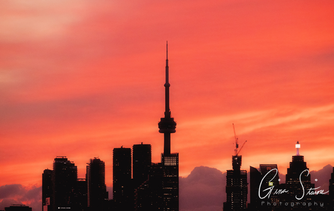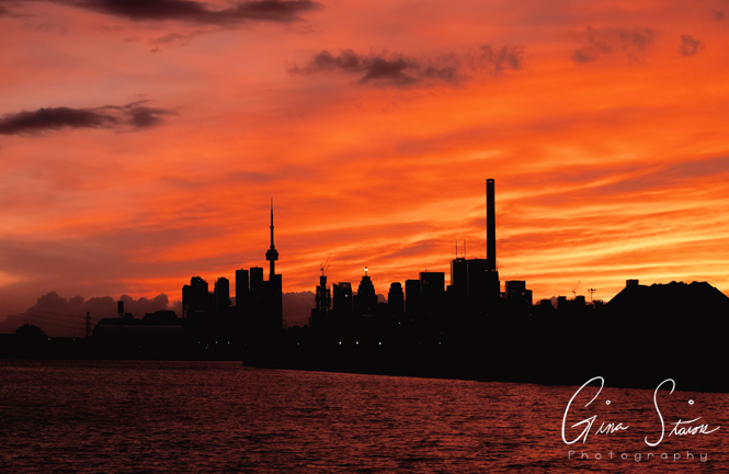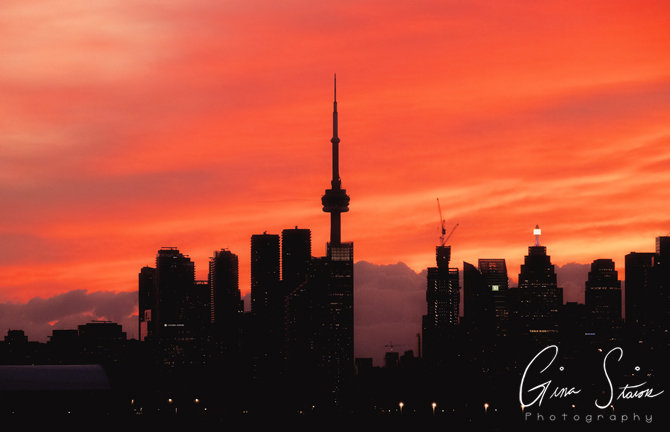 A dramatic sunset paints the sky above the city in shades of red and orange on an autumn evening in Toronto, Ontario, Canada.