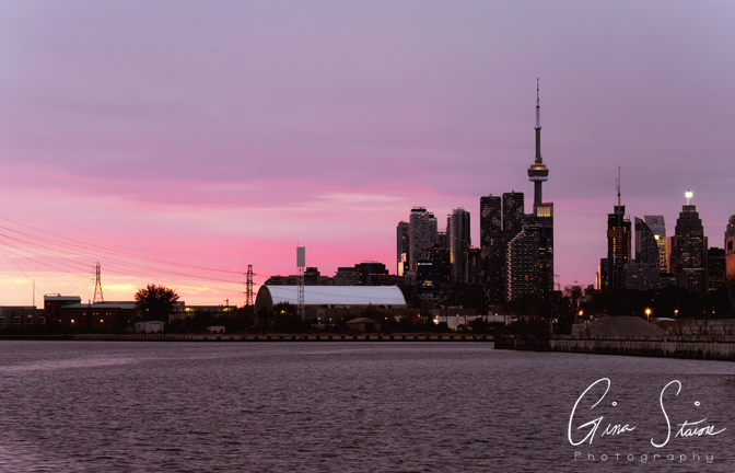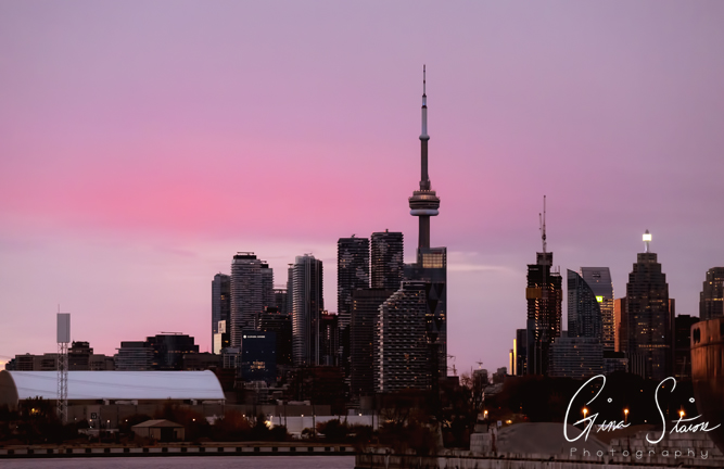 A soft pink and purple sunset above the lake and city’s skyline on an autumn evening in Toronto, Ontario, Canada.