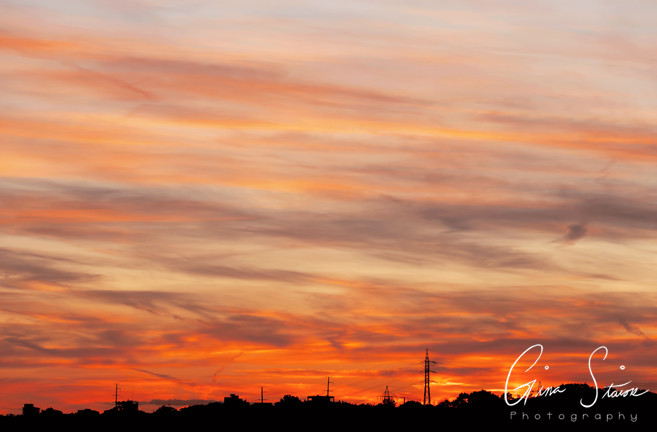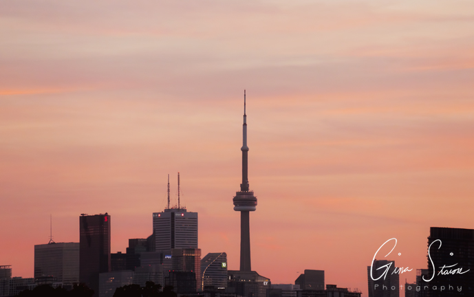 An orange and yellow sunset by the skyline on an autumn evening in Toronto, Ontario, Canada.