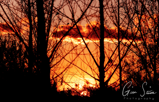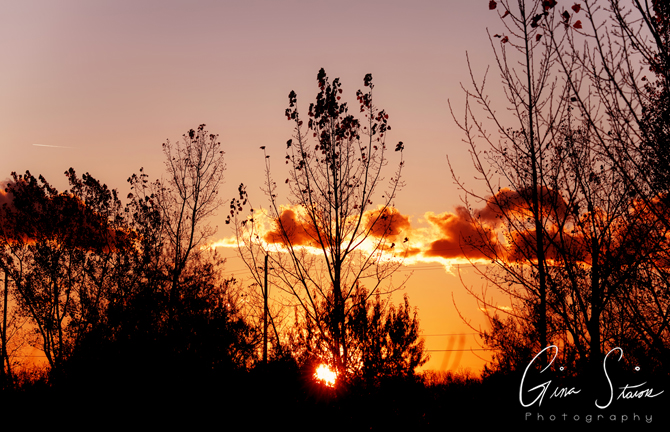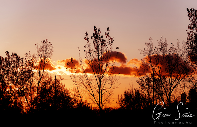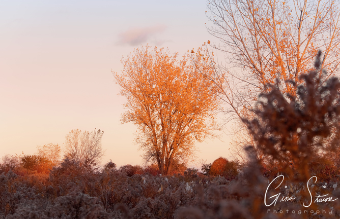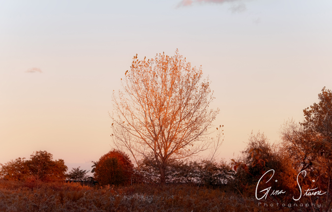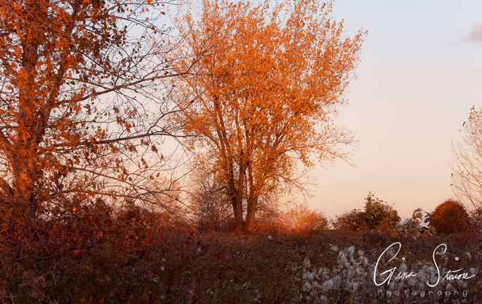 Golden hour sunlight illuminates the trees and surrounding landscape on an autumn evening in Toronto, Ontario, Canada.
