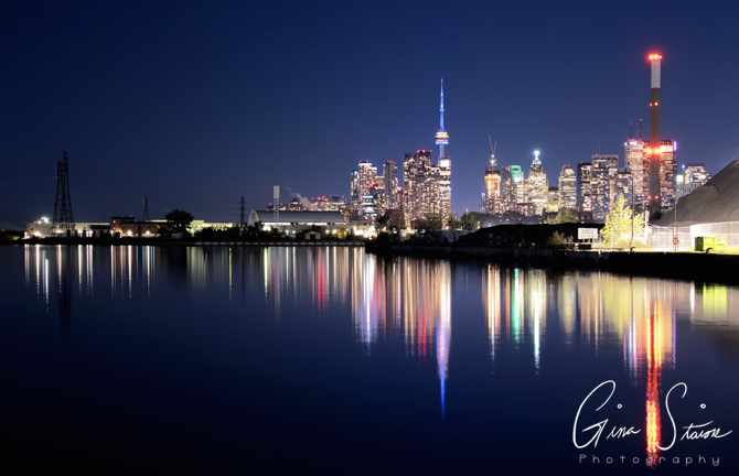 A long exposure of the city’s lights by the lake on an autumn evening in Toronto, Ontario, Canada.