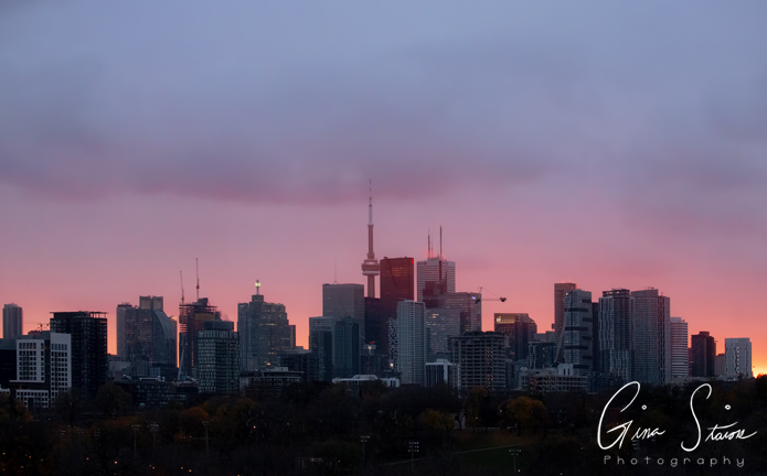 A soft pink and purple sunset by the city’s skyline on an autumn evening in Toronto, Ontario, Canada.