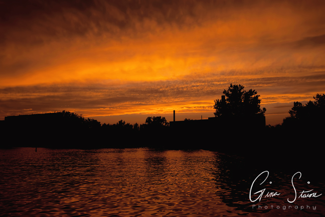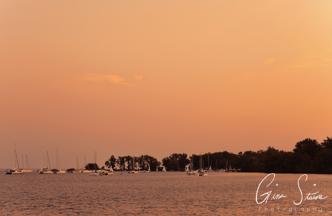 A vivid orange and yellow sunset over the lake on a peaceful summer evening in Toronto, Ontario, Canada.