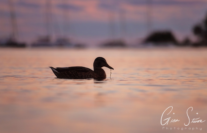A mallard duck swims during a pink and purple sunset on a summer evening in Toronto, Ontario, Canada.