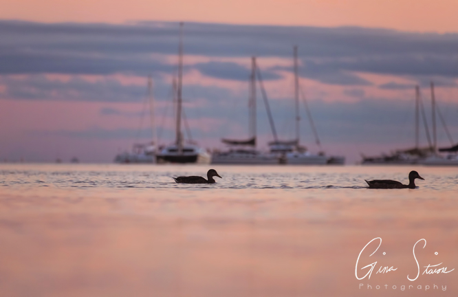 Scenes from Lake Ontario during a peaceful pink and purple sunset featuring mute swans, buffleheads, and ducks in Toronto, Ontario, Canada.