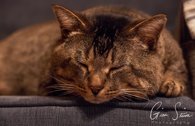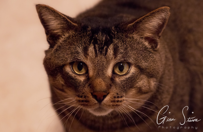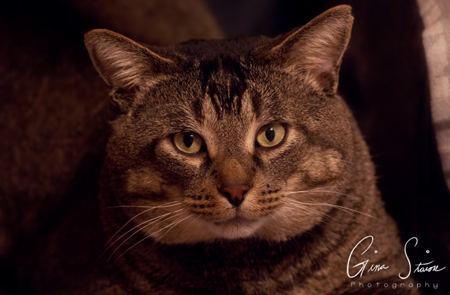 A cute male tabby cat with chubby cheeks relaxing on a late autumn evening in Toronto, Ontario, Canada.