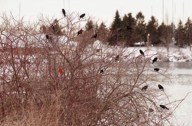 Sparrows, northern cardinals, and red-winged blackbirds enjoy time by the lake on a winter day in Toronto, Ontario, Canada.