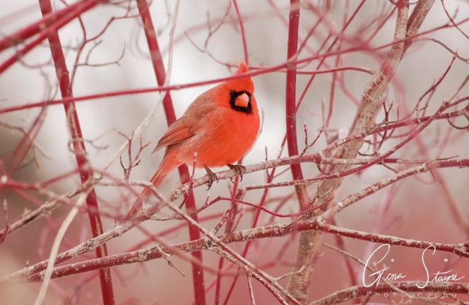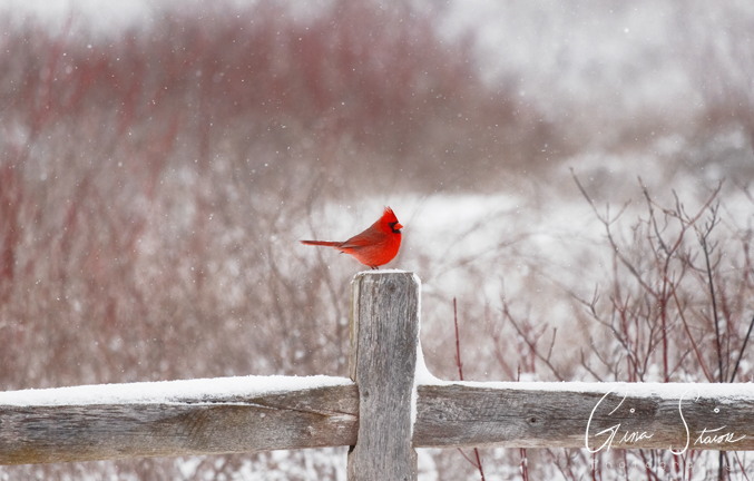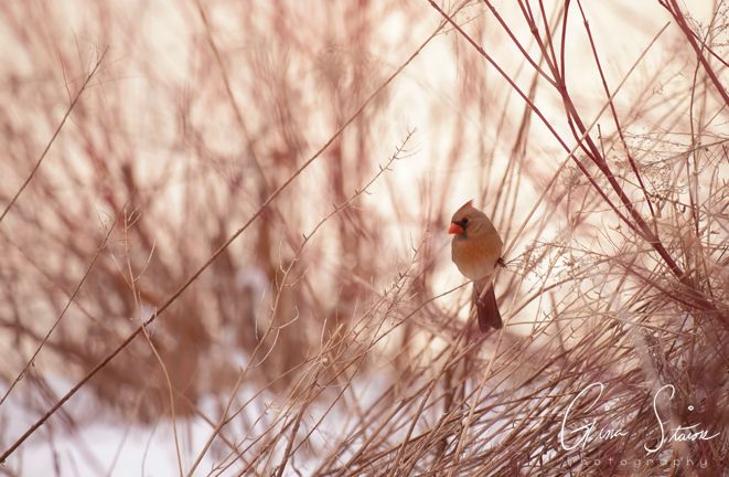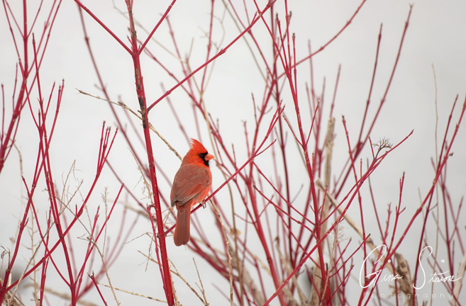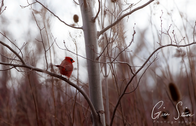 American tree sparrows and northern cardinals spend a cloudy afternoon at the lake in Toronto, Ontario, Canada.