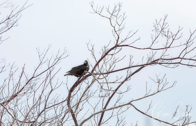 European starlings, northern cardinals, red-winged blackbirds, and common grackles enjoy a cloudy day in the trees just before spring in Toronto, Ontario, Canada.