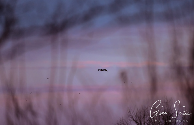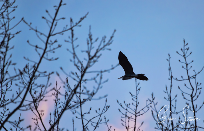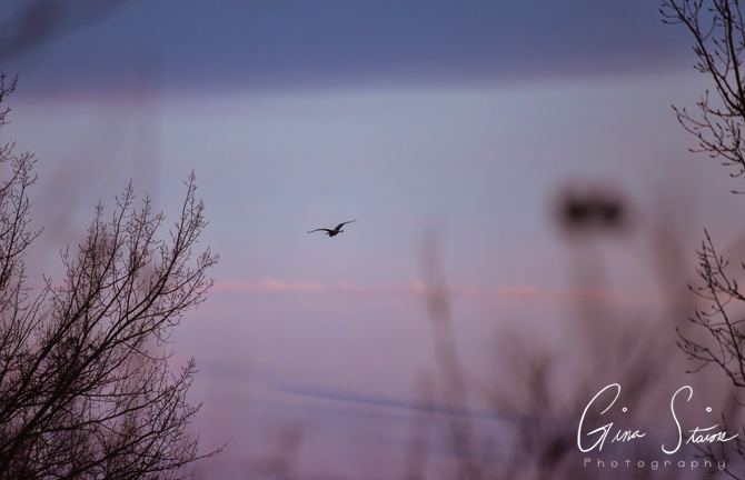A great blue heron flies through the sky while a northern cardinal stands on a bare tree branch during a pink and purple sunset in Toronto, Ontario, Canada.