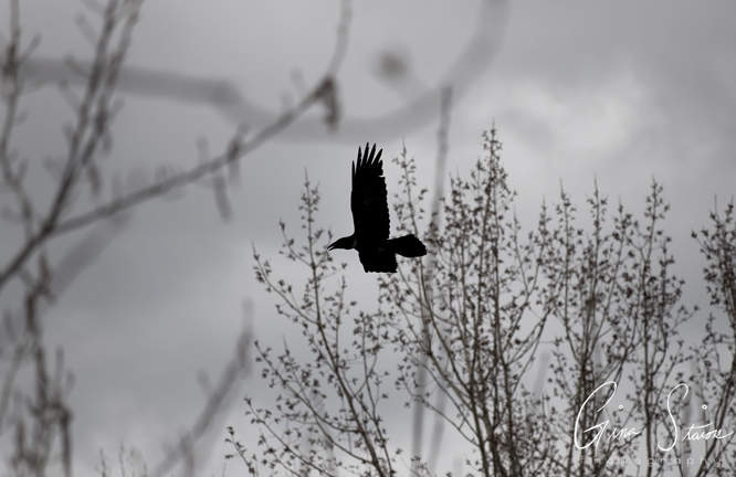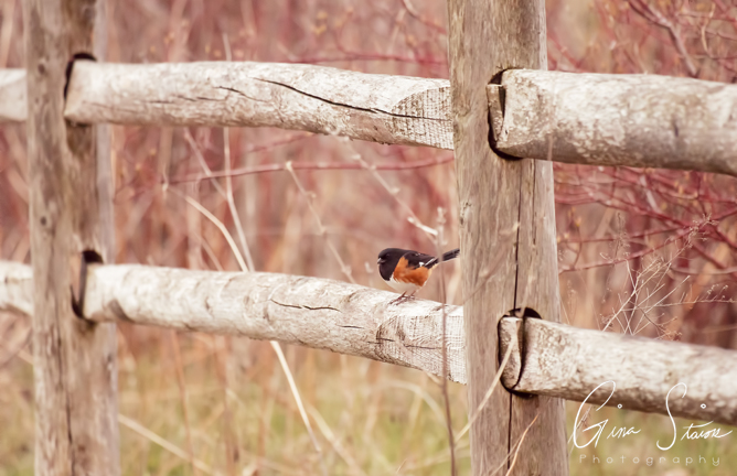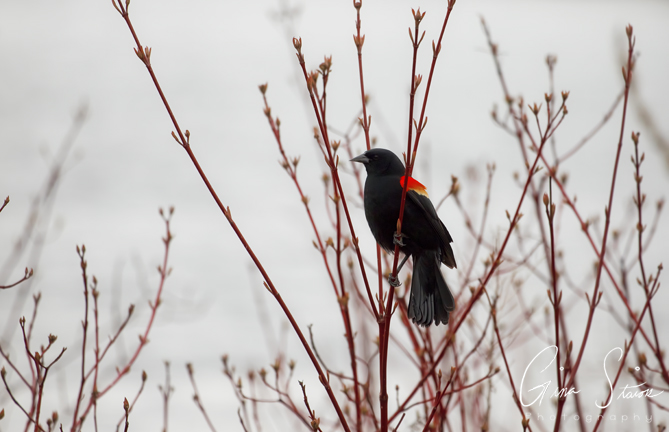 A red-winged blackbird, eastern towhee, northern cardinal, and a common raven out and about during a cloudy spring day in Toronto, Ontario, Canada.