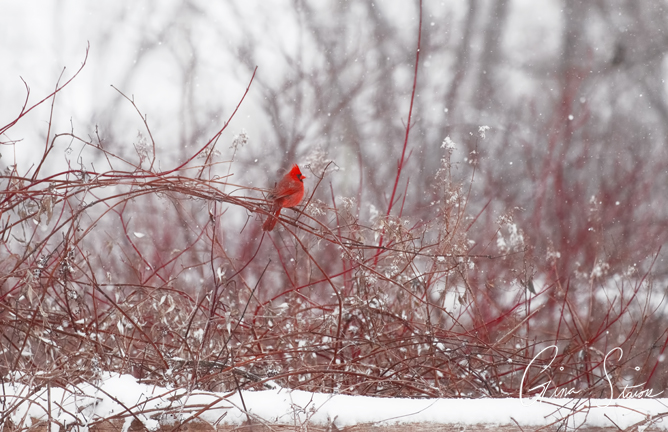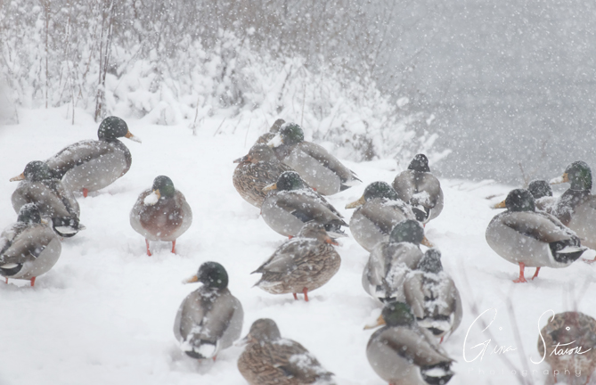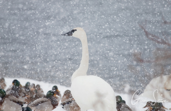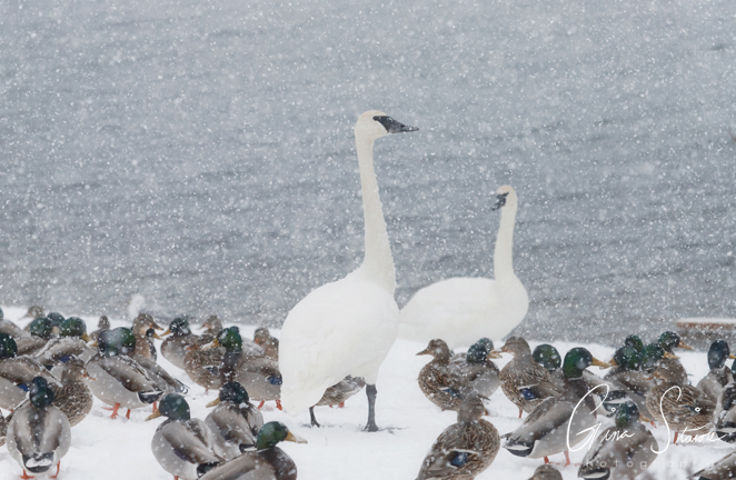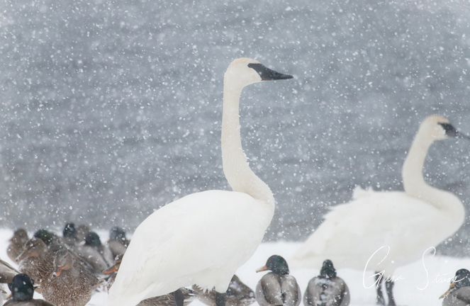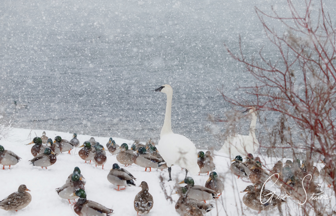 Trumpeter swans, mallard ducks, and a northern cardinal brave the snow on a winter afternoon in Toronto, Ontario, Canada.