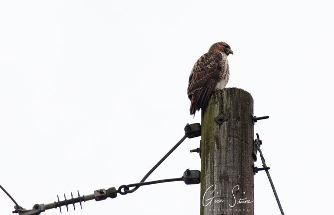A red-tailed hawk sits high up on a telephone pole during a cloudy winter day in Toronto, Ontario, Canada.