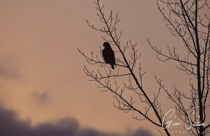 A red-tailed hawk sits high up on a bare tree branch during sunset in Toronto, Ontario, Canada.