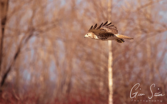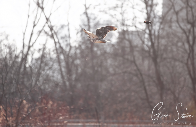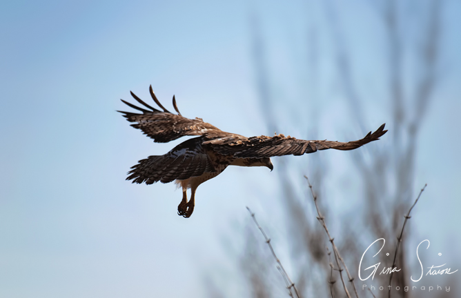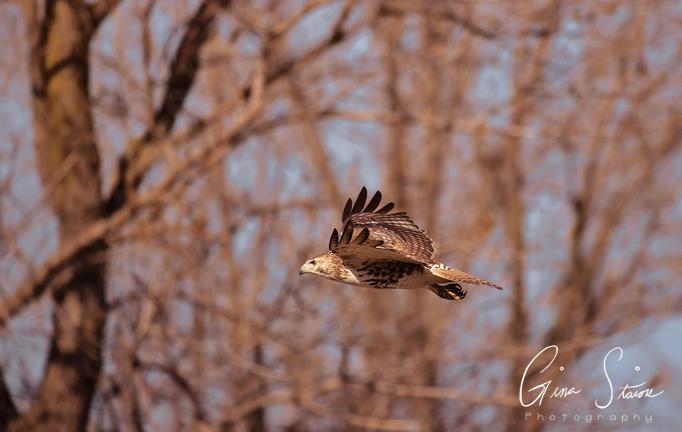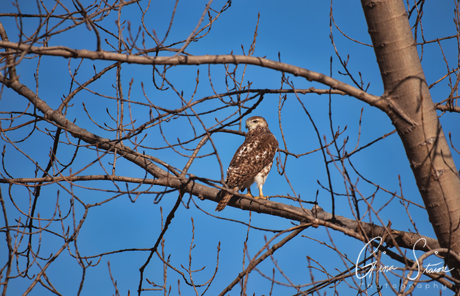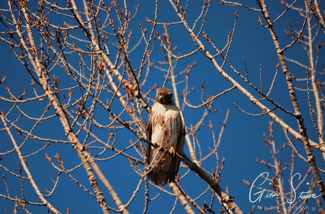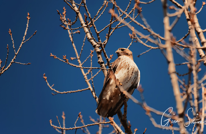 A red-tailed hawk flying and perched on bare tree branches against a blue sky on a spring afternoon in Toronto, Ontario, Canada.