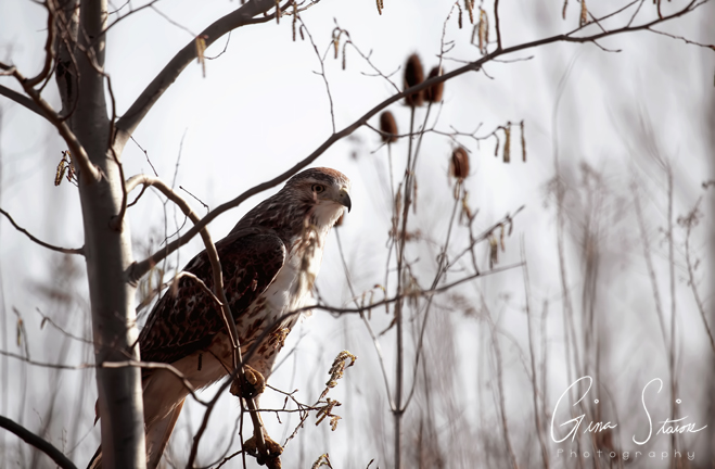 A red-tailed hawk sits high up on a bare tree branch during a cloudy winter day in Toronto, Ontario, Canada.