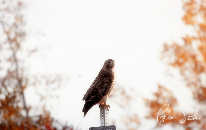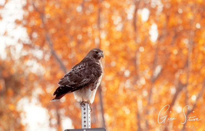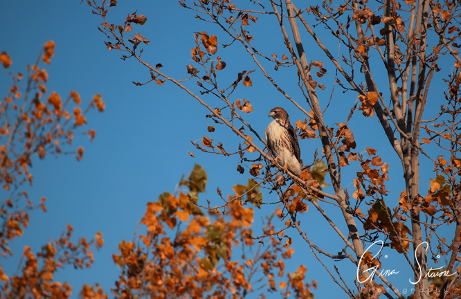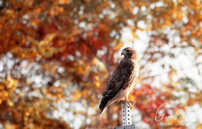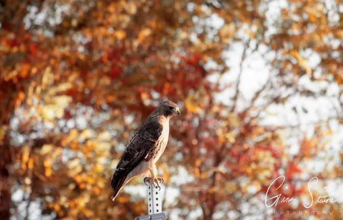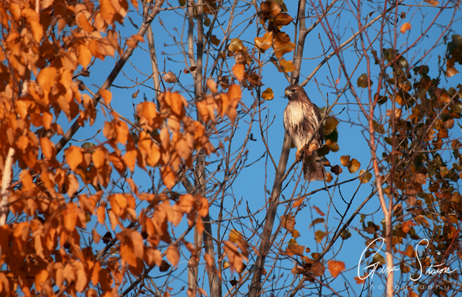 A beautiful red-tailed hawk spends the afternoon among autumn foliage in Toronto, Ontario, Canada.