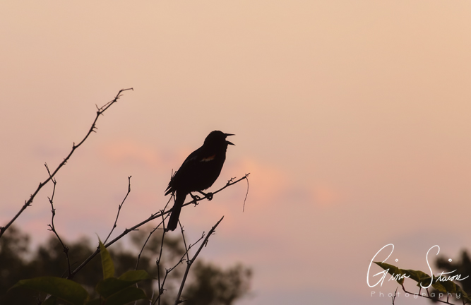 A red-winged blackbird sings during sunset on a peaceful summer evening in Toronto, Ontario, Canada.