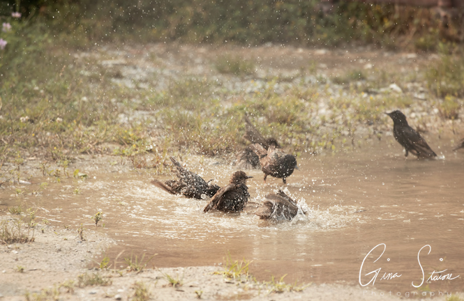A female red-winged blackbird spreads her wings while a group of European starlings bathe in a nearby puddle on a hot summer afternoon in Toronto, Ontario, Canada.