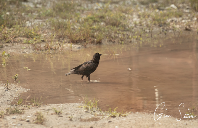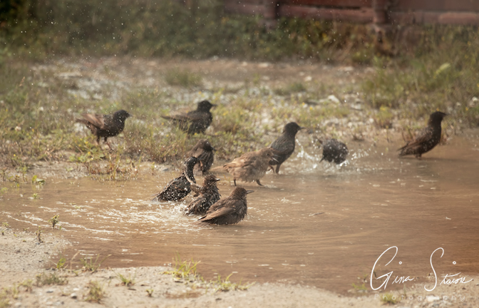 A female red-winged blackbird spreads her wings while a group of European starlings bathe in a nearby puddle on a hot summer afternoon in Toronto, Ontario, Canada.