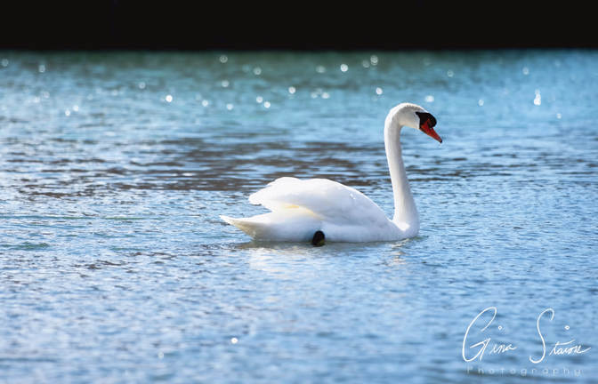 A mute swan swims atop a glittering lake on a spring afternoon in Toronto, Ontario, Canada.
