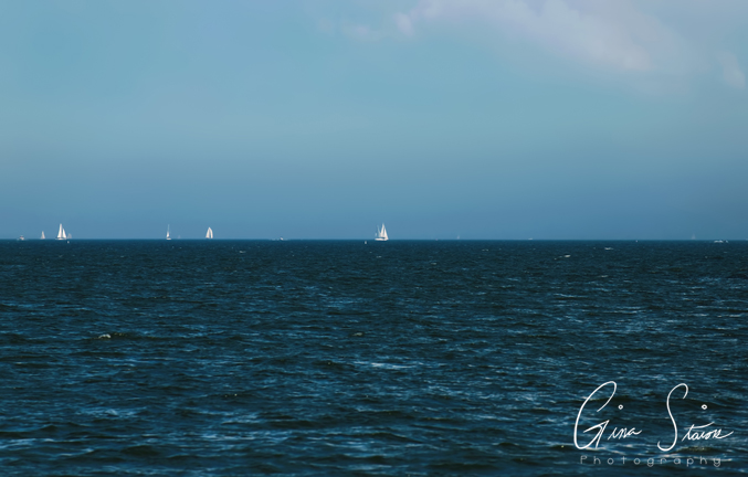 A hazy blue sky above a calm Lake Ontario on a sunny summer day in Toronto, Ontario, Canada.