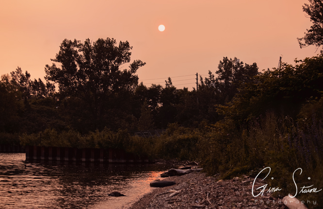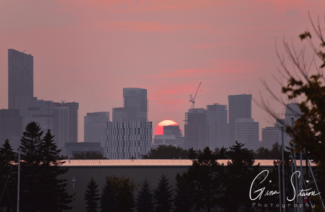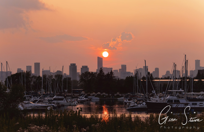 Smoke from nearby wildfires result in a hazy red and orange sunset with the sun clearly visible in the sky on a summer evening in Toronto, Ontario, Canada.