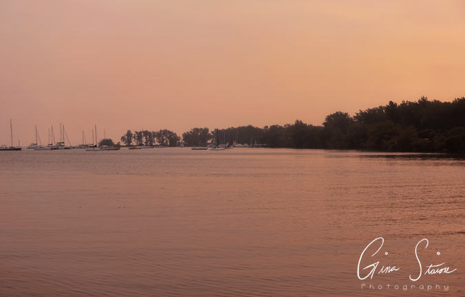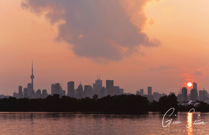 An orange sunset above the city and a purple-pink sky above the lake on a calm summer evening in Toronto, Ontario, Canada.