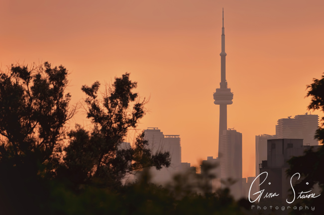 The city’s skyline as seen through the trees on a cloudy and muggy summer afternoon in Toronto, Ontario, Canada.