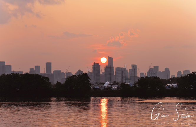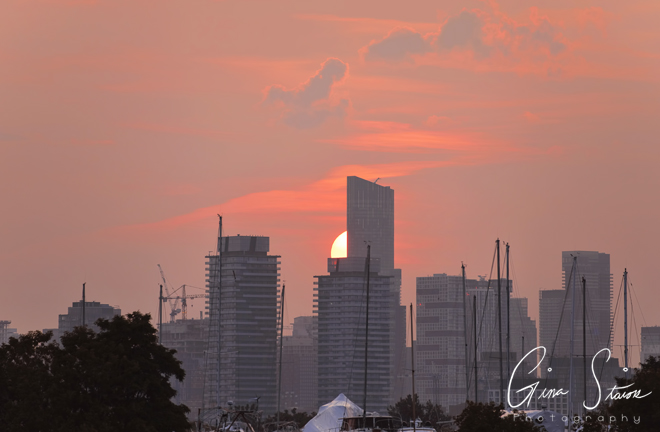 A hazy sky results in a clear outline of the sun as it sets above the city on a hot and humid summer evening in Toronto, Ontario, Canada.