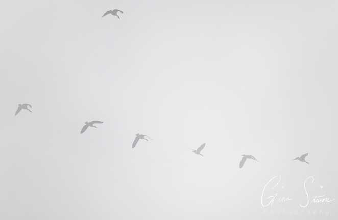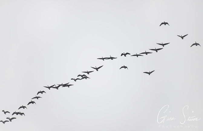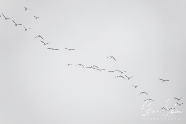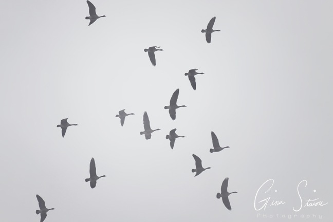 Mute swans, Canada geese, and double-crested cormorants spend an afternoon by the lake on a foggy and cloudy spring afternoon in Toronto, Ontario, Canada.