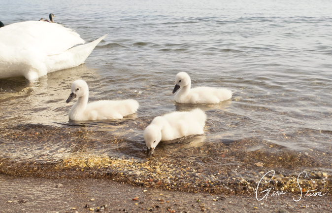 Canada goose parents spend time with their young goslings by the lake during a sunny spring afternoon in Toronto, Ontario, Canada.
