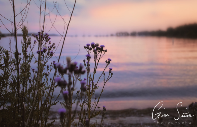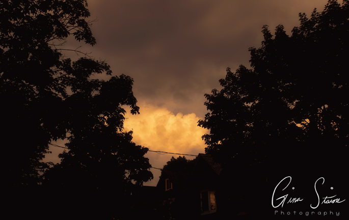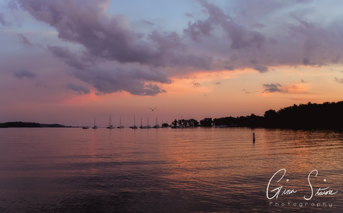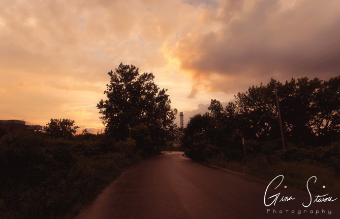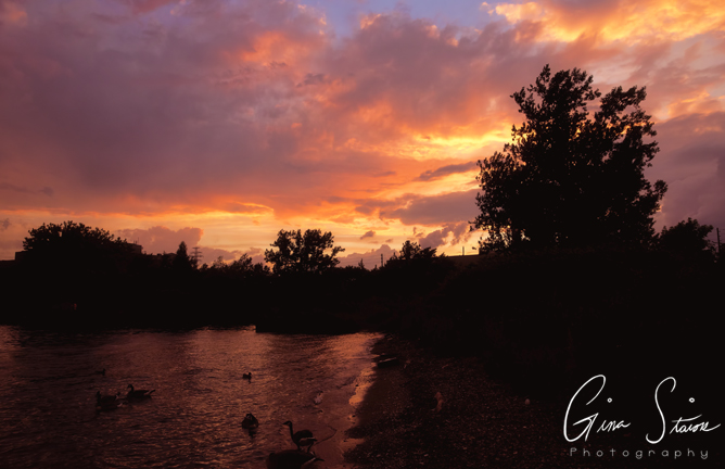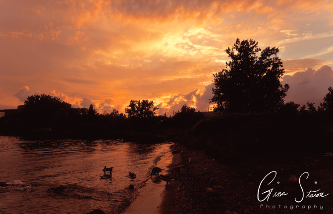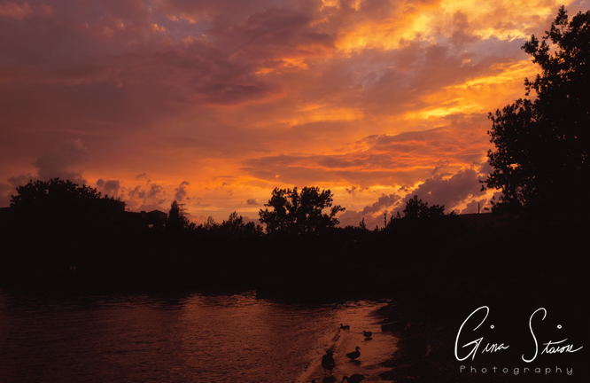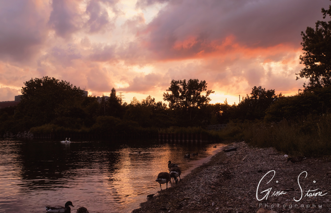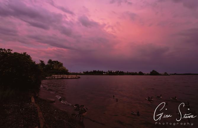 The sunset changes from shades of orange and yellow, red and purple, and pink and purple on a spring evening by the city’s skyline in Toronto, Ontario, Canada.