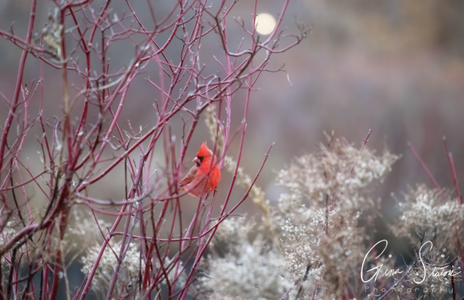 A lovely cardinal sits upon an empty branch on a cloudy afternoon in Toronto, Ontario, Canada.