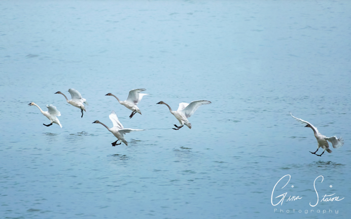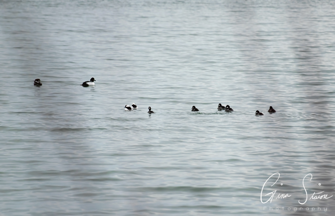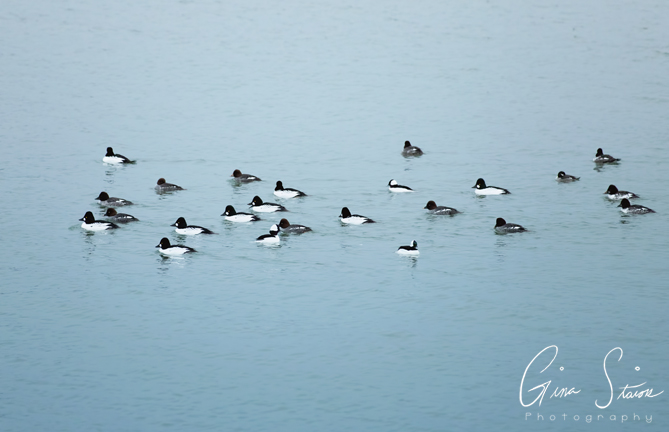 A flock of birds consisting of long-tailed ducks, common goldeneyes, and buffleheads swim atop a calm lake during winter in Toronto, Ontario, Canada. A group of trumpeter swans make their landing in almost unison.