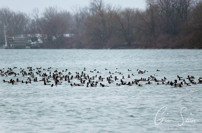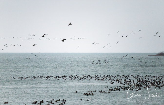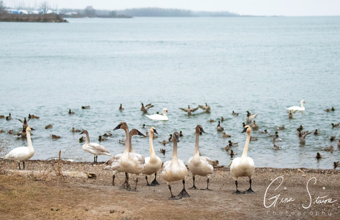 Various groups of birds by the lake on a cloudy winter afternoon in Toronto, Ontario, Canada.