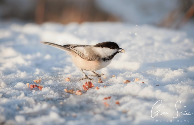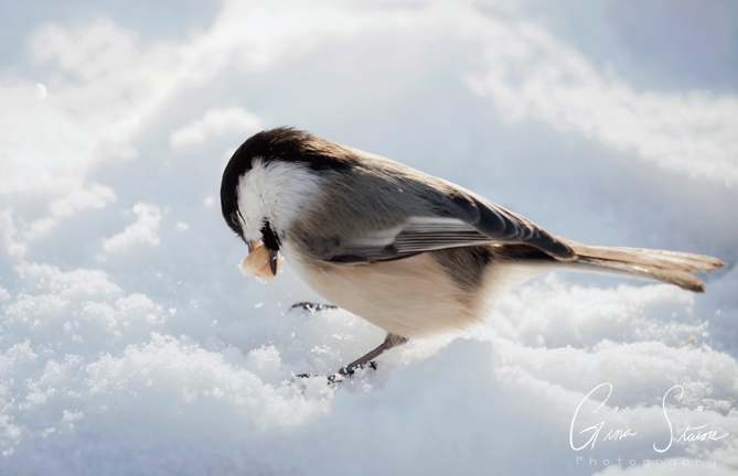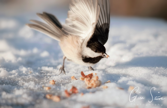 Black-capped chickadees enjoying a snowy winter afternoon in Toronto, Ontario, Canada.