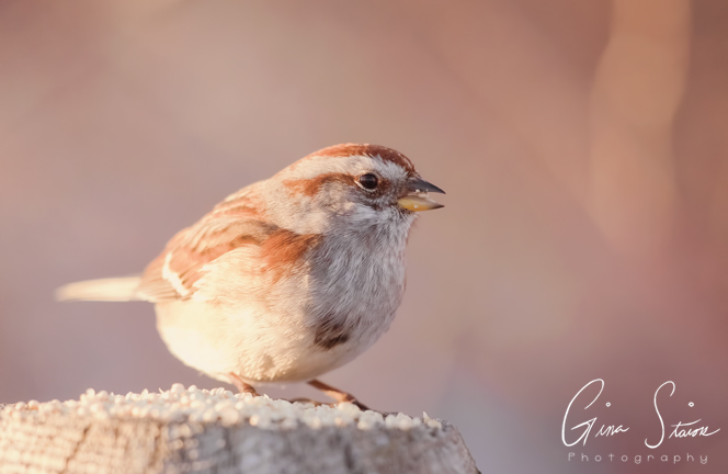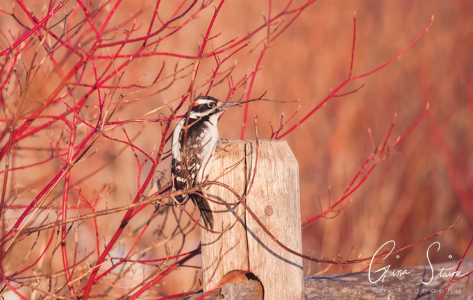 A hairy woodpecker and an American tree sparrow in golden hour sunlight during winter in Toronto, Ontario, Canada.