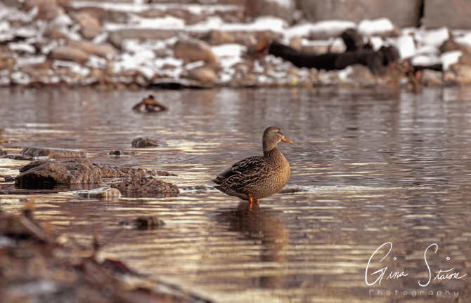 A female mallard duck overlooking the lake during golden hour on a winter evening in Toronto, Ontario, Canada.