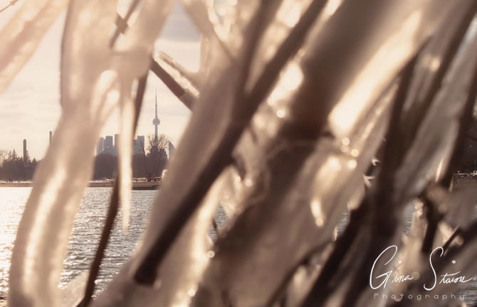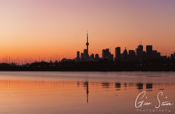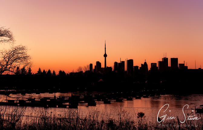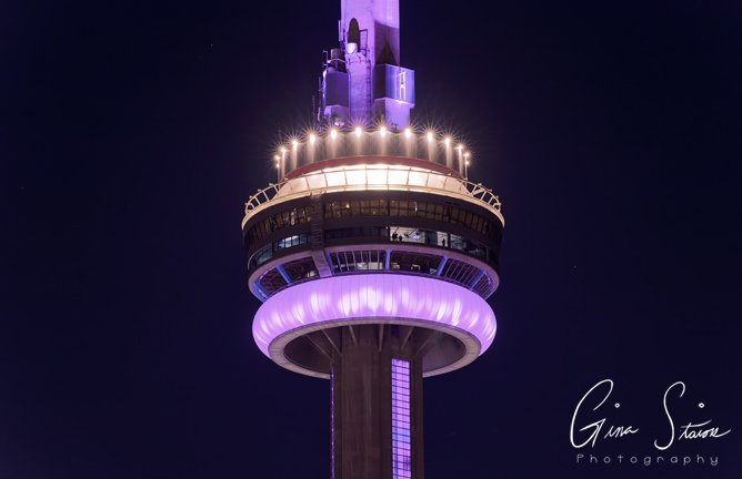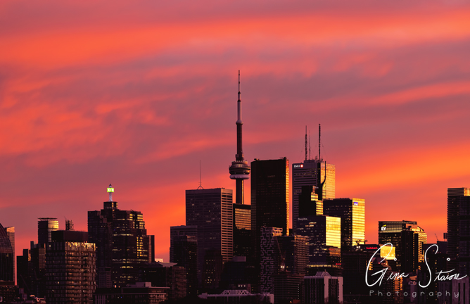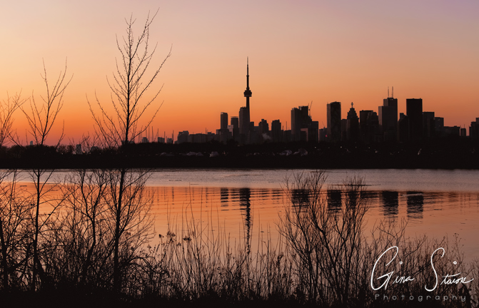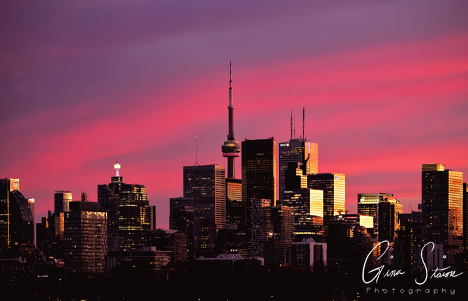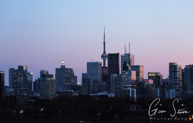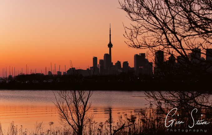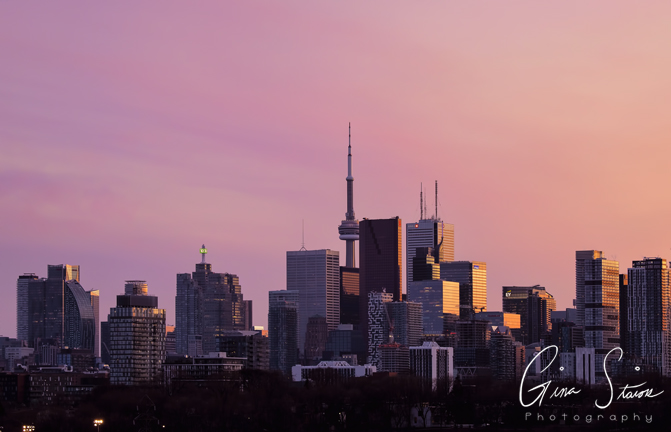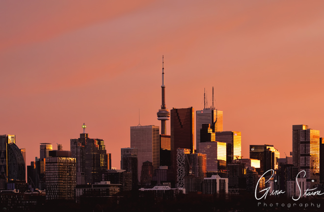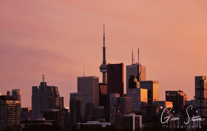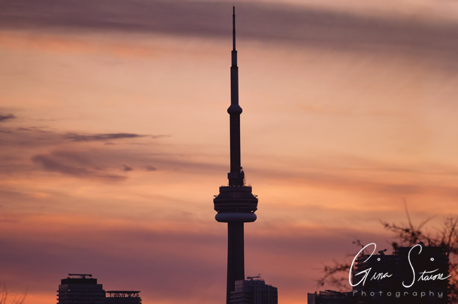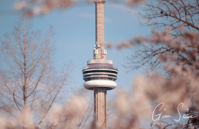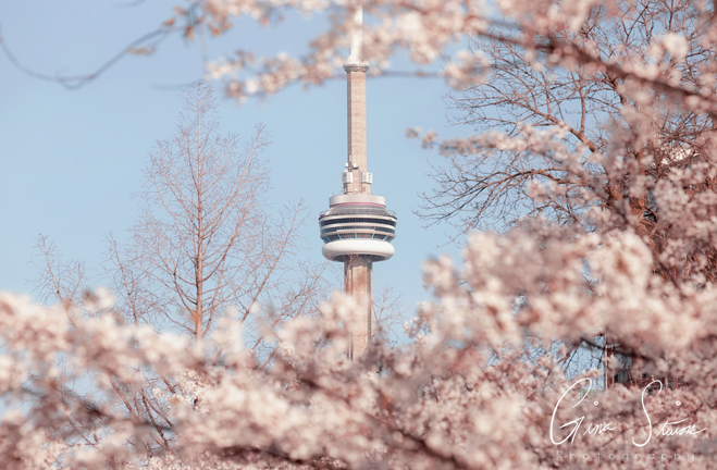 Pretty pink cherry blossoms bloom in the sunlight during a peaceful spring afternoon in Toronto, Ontario, Canada. The CN Tower stands tall in the background.