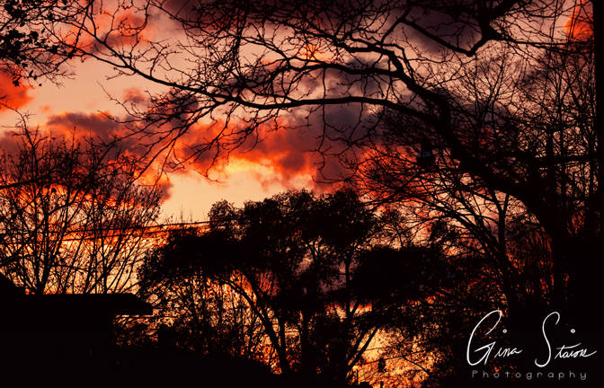 An intense sunset lights up the sky beyond the trees on an autumn evening in Toronto, Ontario, Canada.