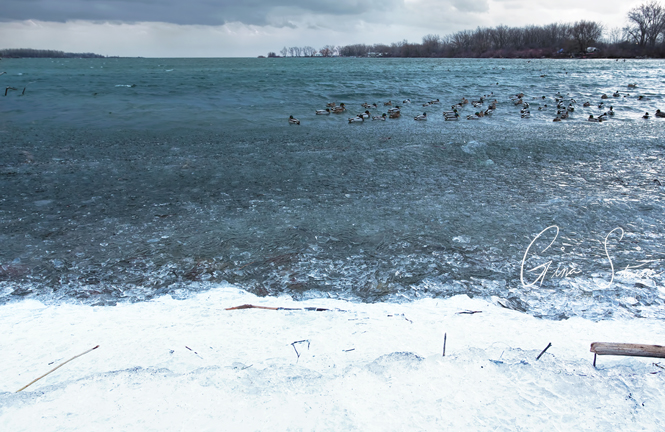 A calm, winter scene of Lake Ontario during a sunny afternoon.