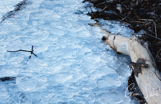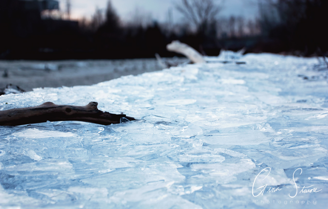 This spot has very quickly become one of my favourite photo taking spots. When we visited the day before, sand on the beach was still visible. There were a few branches by the shore that were covered in layers of ice, but as far as the landscape looking like a scene out of a winter wonderland, that wasn’t the case. I was in shock at how quickly everything froze over the next day. The water closest to the shore was frozen and just past that, small chunks of ice were floating in the water. If one listened closely, they would be able to hear the tinkling sounds of the ice pieces colliding with one another. The waves almost resembled slush as there was so much ice.