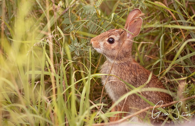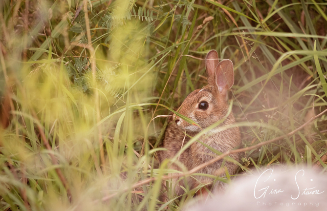 A cute rabbit hides in the tall grass during a peaceful summer day in Toronto, Ontario, Canada.