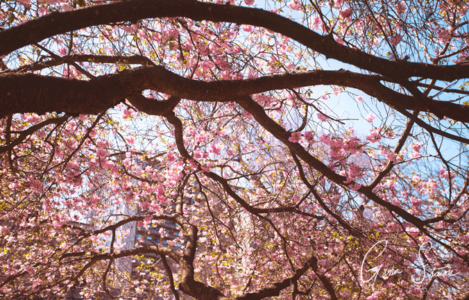 Pink blossoms blooming in the golden afternoon light during spring in Toronto, Ontario, Canada.