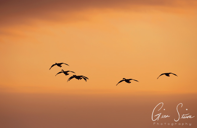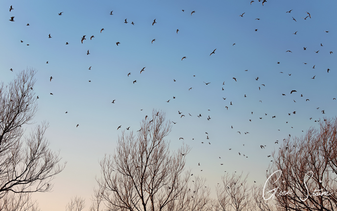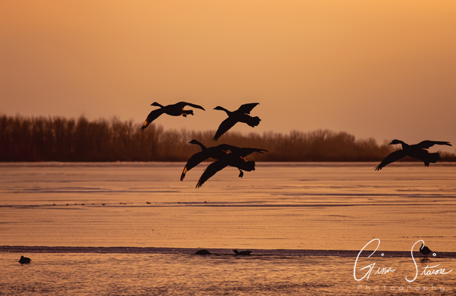 Flocks of birds fly above Lake Ontario during sunset in Toronto, Ontario, Canada.