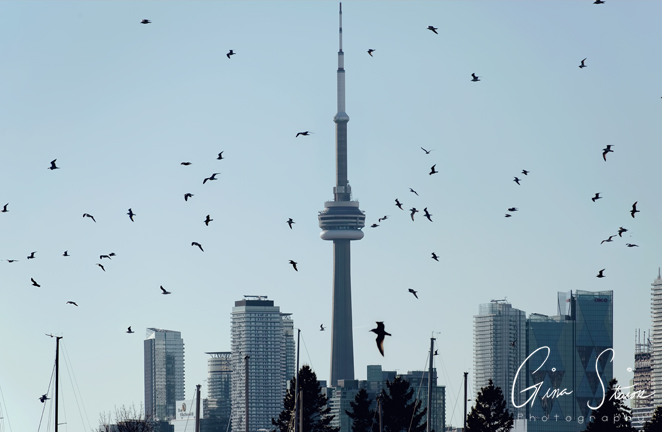 A flock of seagulls take flight against the city’s skyline on a clear blue day in Toronto, Ontario, Canada.