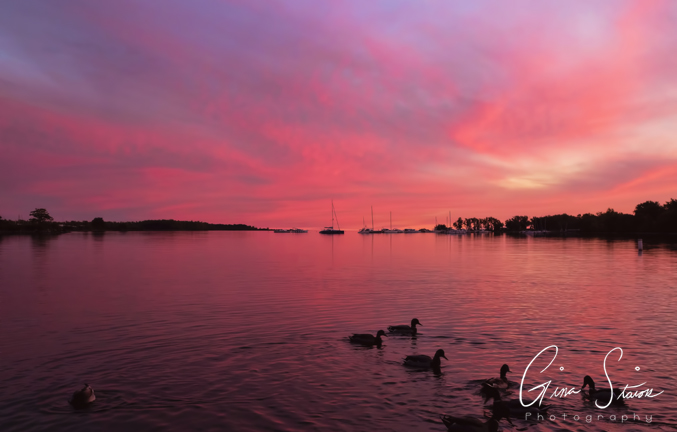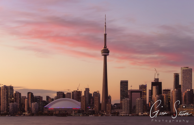 A stunning pink sunset lights up the sky above Lake Ontario during an autumn evening in Toronto, Ontario, Canada.