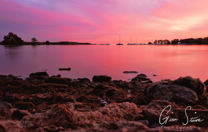 A quiet long exposure photo of a rock and a waterscape during a summer evening in Toronto, Ontario, Canada.