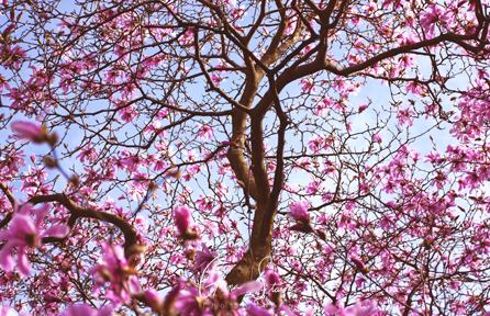 Blooming magnolias on a sunny spring day. The blue sky and bright sunlight made a beautiful backdrop for these gorgeous flowers.